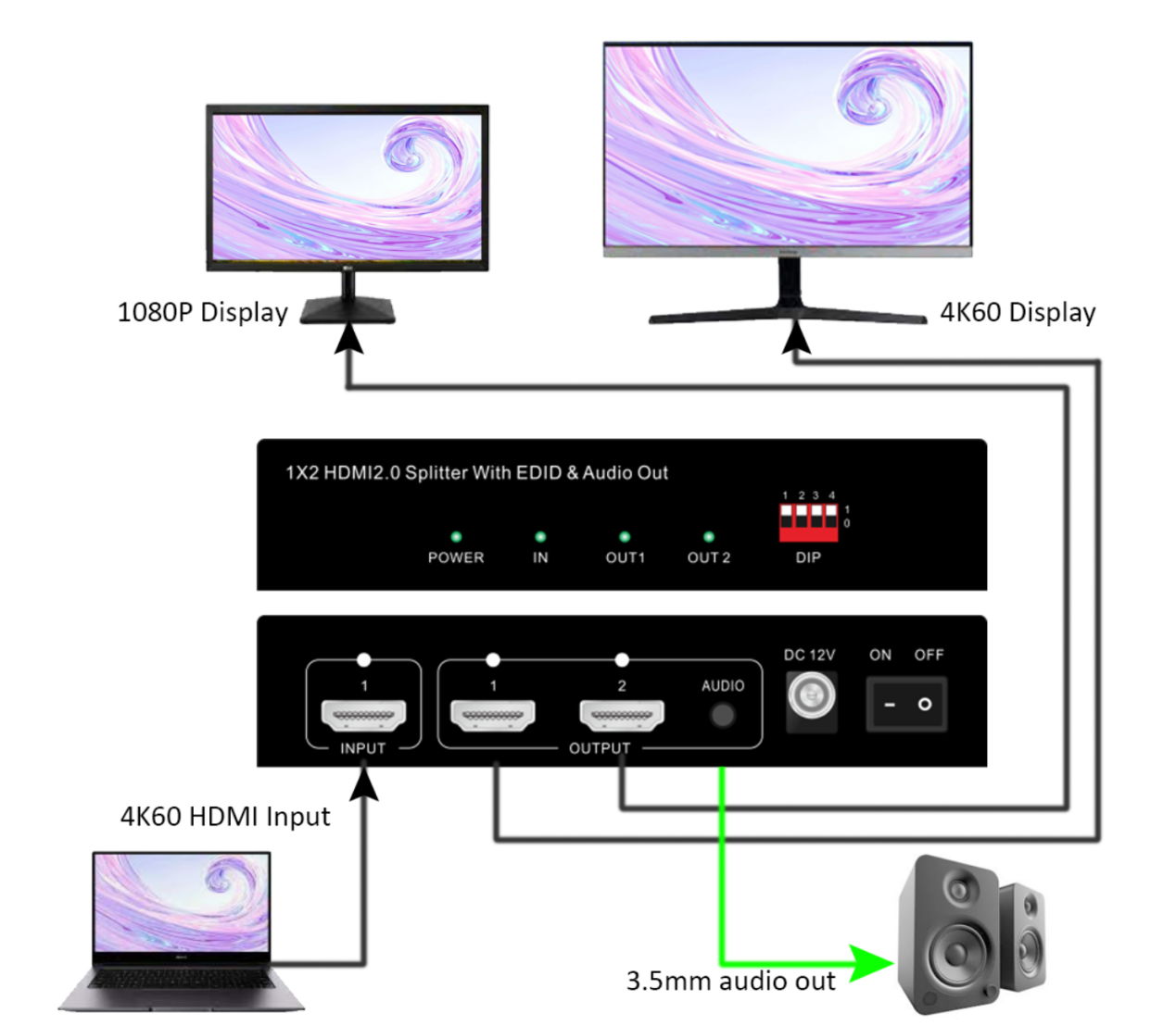 This high performance 18Gbps 1×2 HDMI2.0 Splitter, it can support 1 HDMI input to 2 HDMI outputs simultaneously. The resolution is up to 4K60Hz. It supports EDID management, auto scaling function to fix different display resolutions, also with one 3.5mm audio de-embedded function. The ON/OFF power switch provides conveniences for users to turn it ON/OFF without the power cable plugging and unplugging.