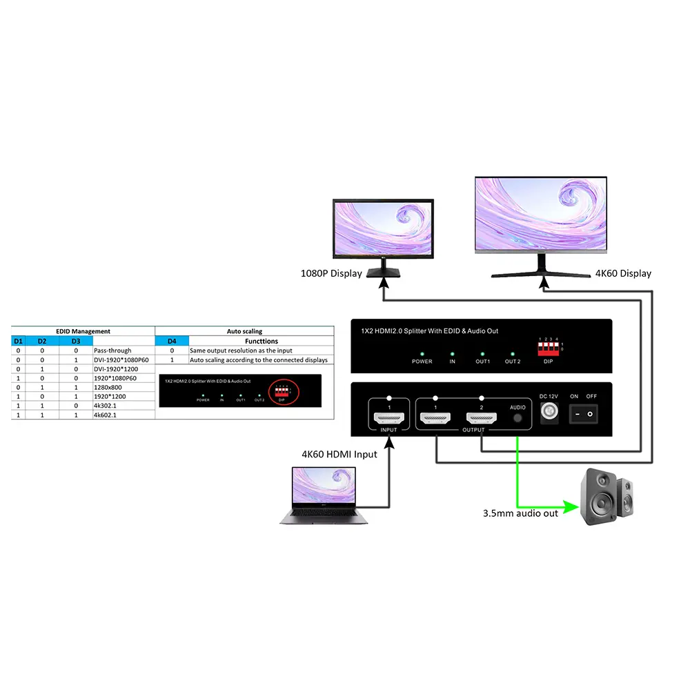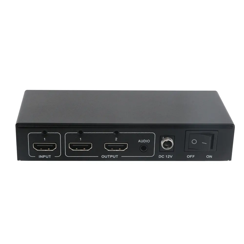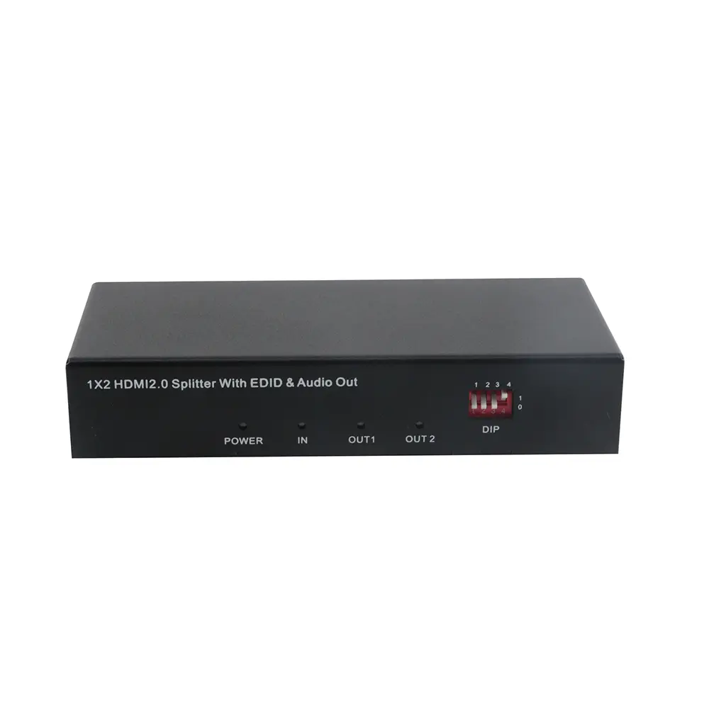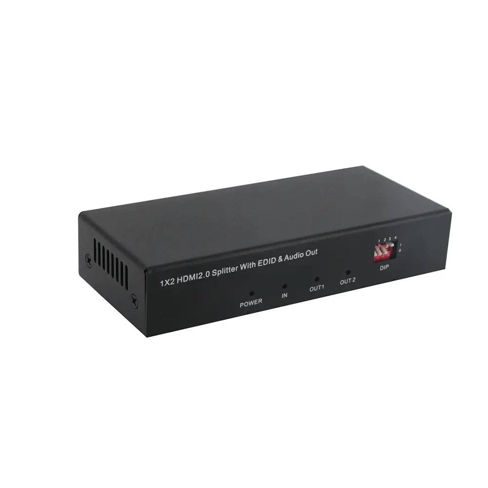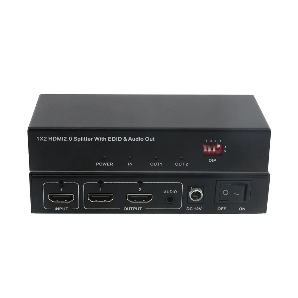 This high performance 18Gbps 1×2 HDMI2.0 Splitter, it can support 1 HDMI input to 2 HDMI outputs simultaneously. The resolution is up to 4K60Hz. It supports EDID management, auto scaling function to fix different display resolutions, also with one 3.5mm audio de-embedded function. The ON/OFF power switch provides conveniences for users to turn it ON/OFF without the power cable plugging and unplugging.