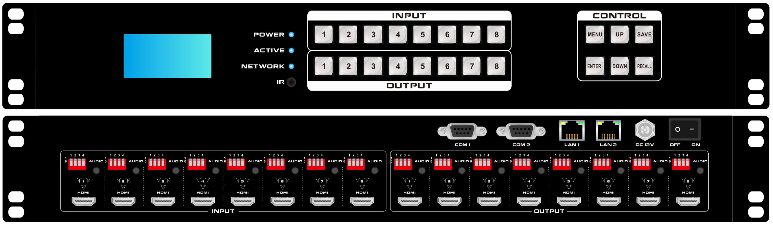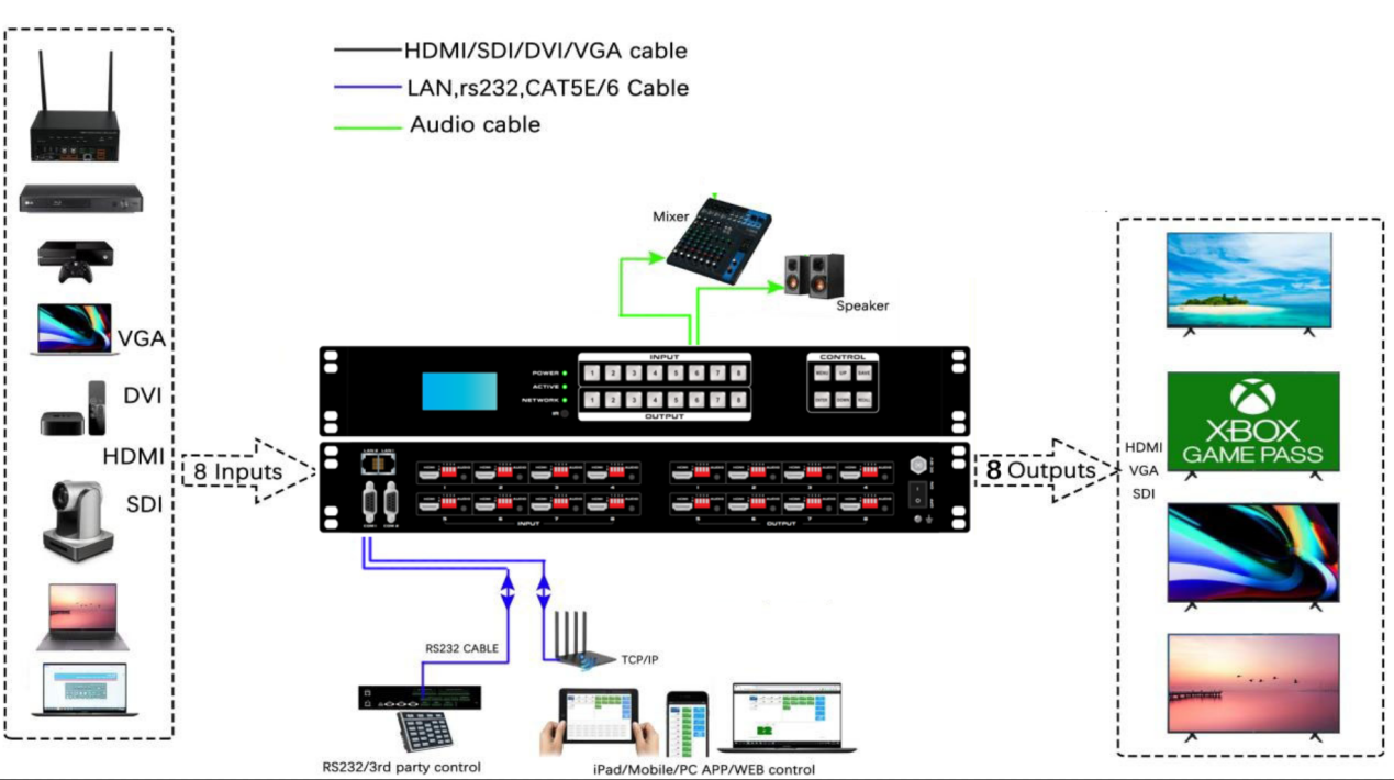 - 8 HDMI inputs with 8 audio in and 8 HDMI outputs with 8 audio outs