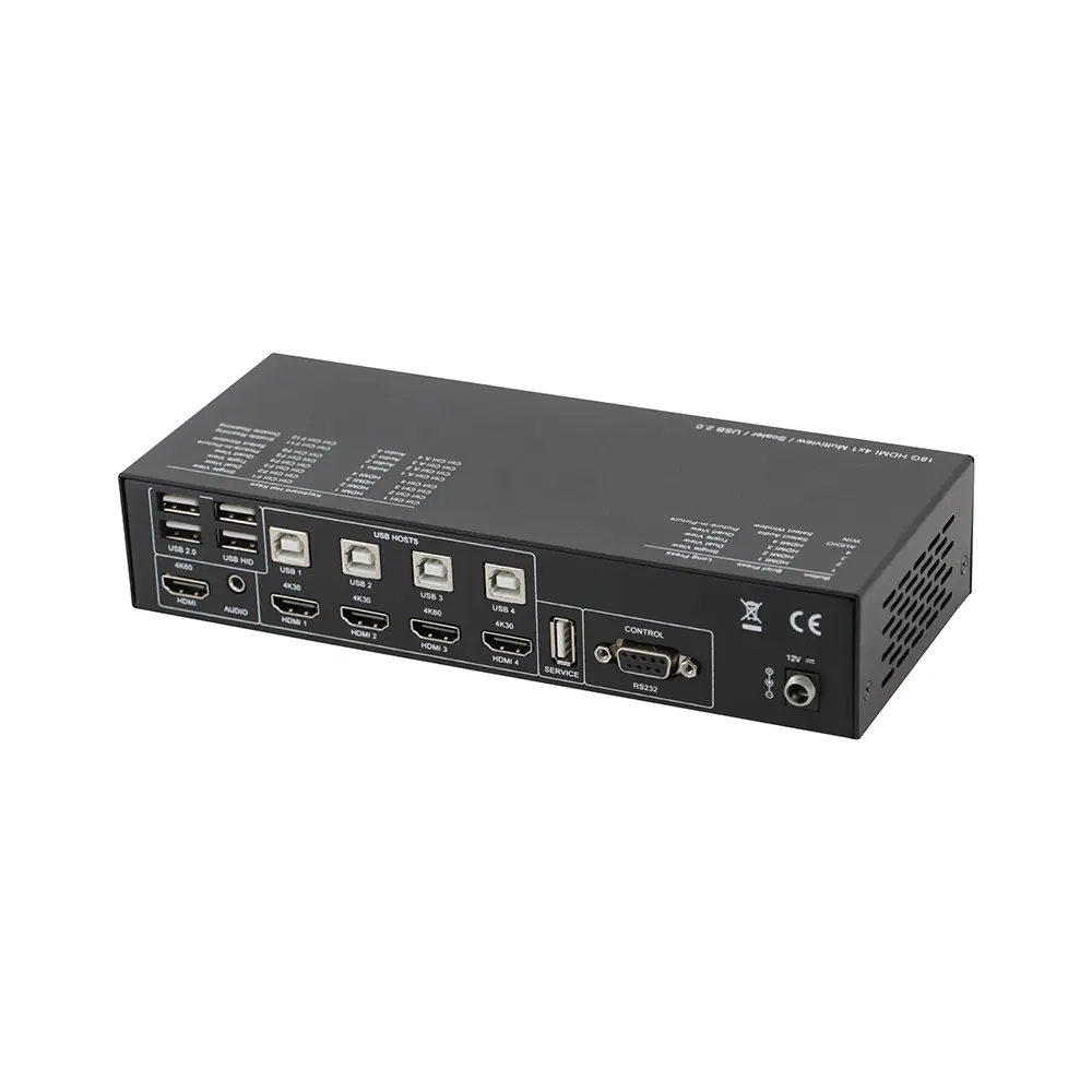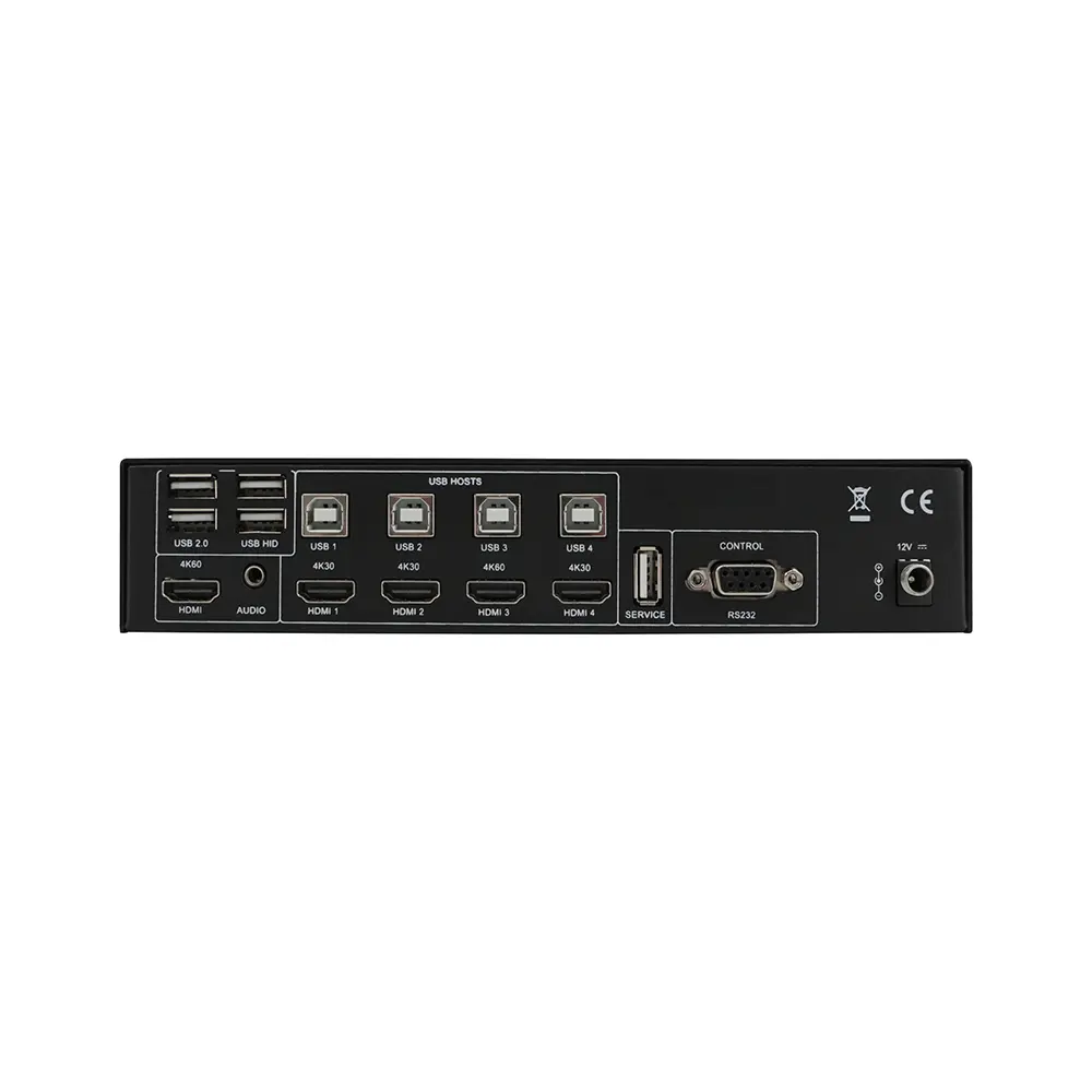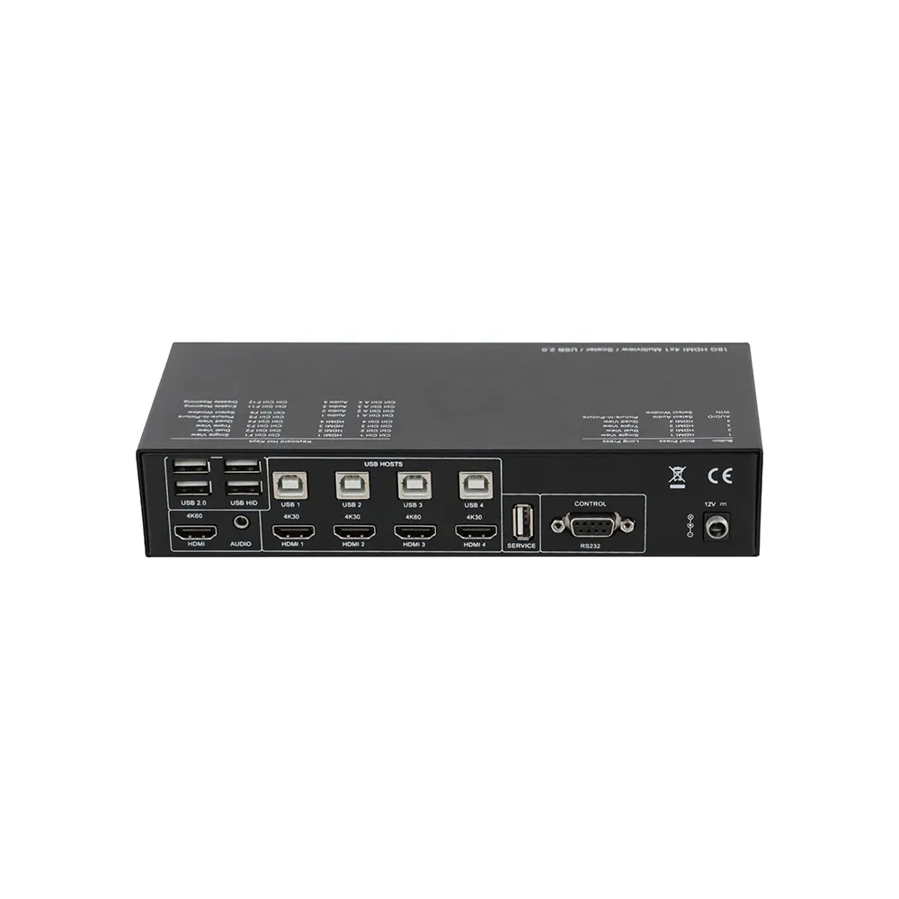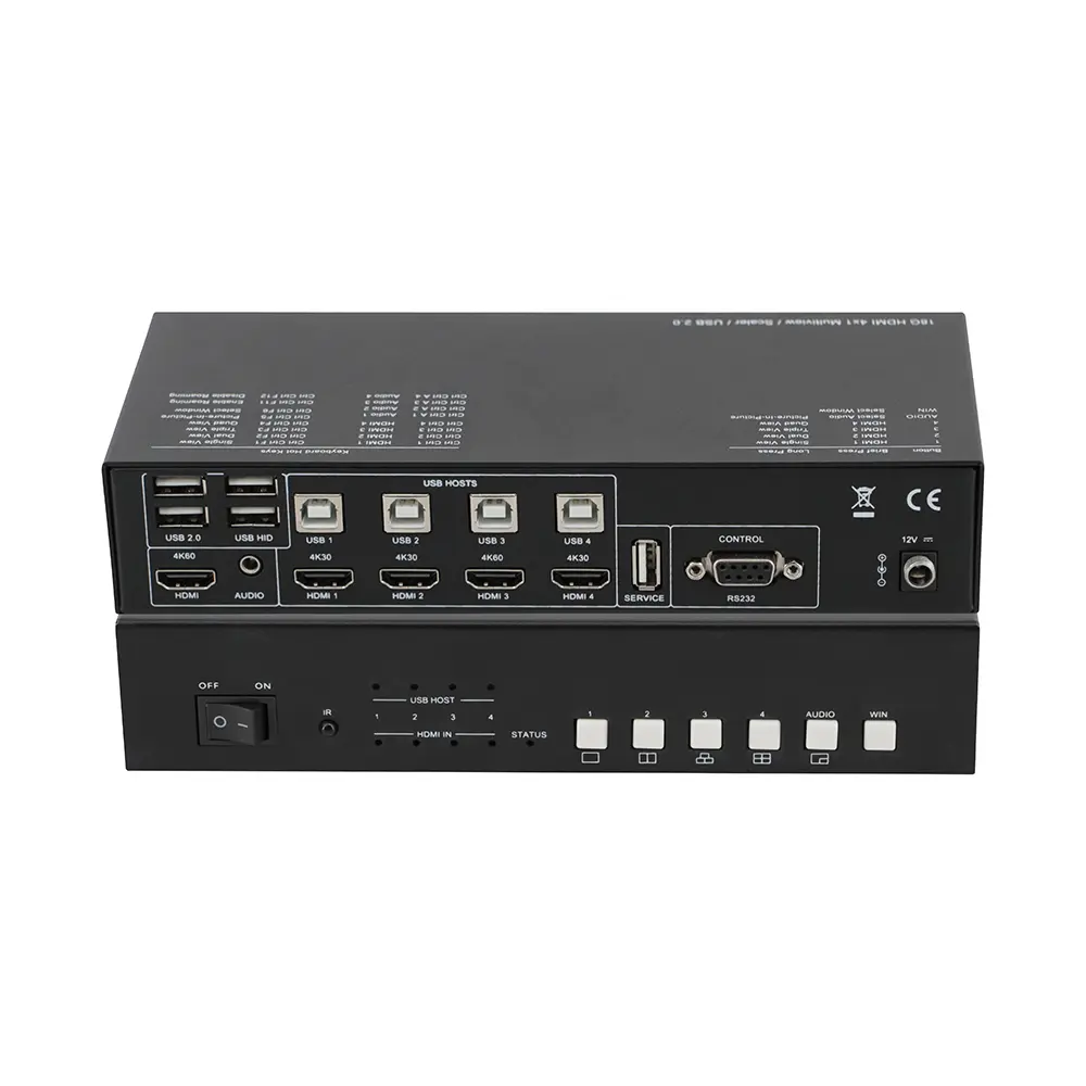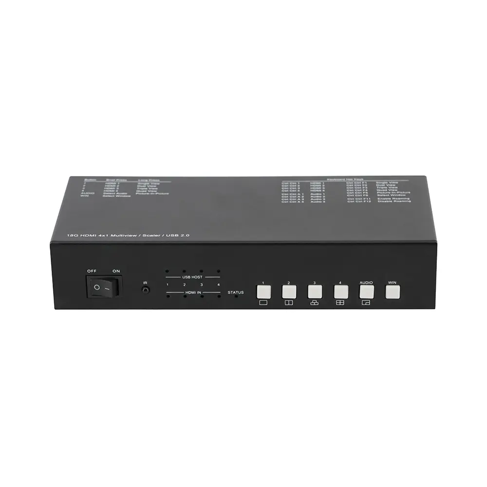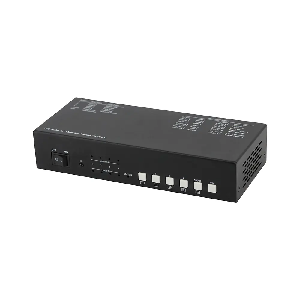 This is a high-performance 4K60 4X1 HDMI Multi-Viewer with fast switching switcher, which can display 4 channels of ultra-high-definition video signals on the same screen at the same time. Users can choose different screen splitting methods and switch between 4 channels of input signals. It supports 4K60/ 4K30/ 1080P/720P output and 3.5mm audio de-embedded, the input resolutions can up to 4K(three 4K30 inputs and one 4K60 input), when the 4 input signals are 1080p60 or below can truly realize the point-to-point lossless display. This multi-viewer also supports audio switching, which can switch the sound of any input signals. It can supports multiple control methods, users can control the device through the front push-button,IR remote or the professional RS232. In general, it is a very practical 4K60 multi-viewer with stable performance, simple installation, flexible control, which can be widely used in games, professional conferences, radio and television, security monitoring, securities markets and other fields .