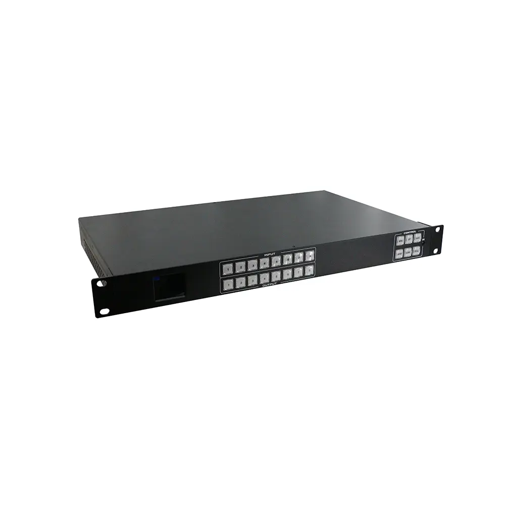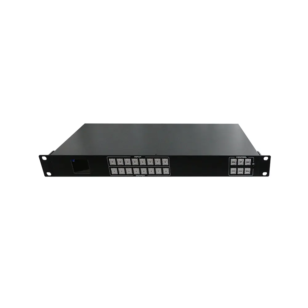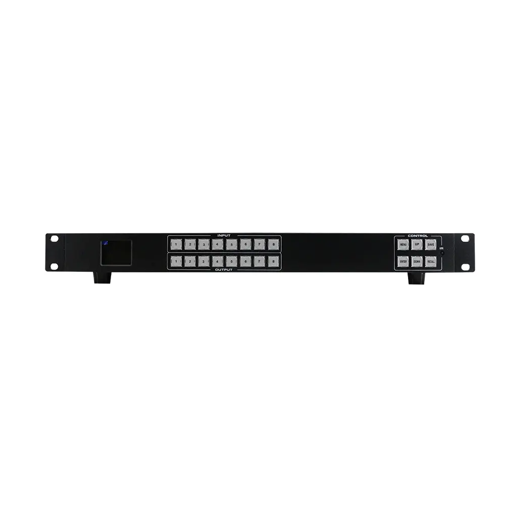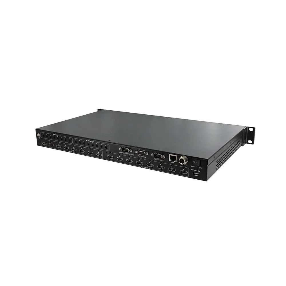 8×8 4K60シームレススイッチングスプリットスプライシングマトリックス(APPモデル)は、様々なシーンに適した汎用性の高い4×4 Ultra HDオーディオ/ビデオHDMIシームレススイッチングマトリックスです。4系統のHDMI 2.0入力と4系統のHDMI 2.0出力を備え、それぞれ1080pから4K60 4:4:4フルHDまでのフォーマットとすべての3Dフォーマットに対応しています。出力は、マトリックススプライシングとスプリッティングの2つのモードで設定できます。また、4チャンネルの3.5mmアナログオーディオのエンベッド/ディエンベッドにも対応しています。独立したEDID管理をサポートし、リモコン、RS-232、LANポート、フロントパネルボタンでコントロールできます。フロントパネルに内蔵されたTFTスクリーンは、動作状態をリアルタイムで表示します。.