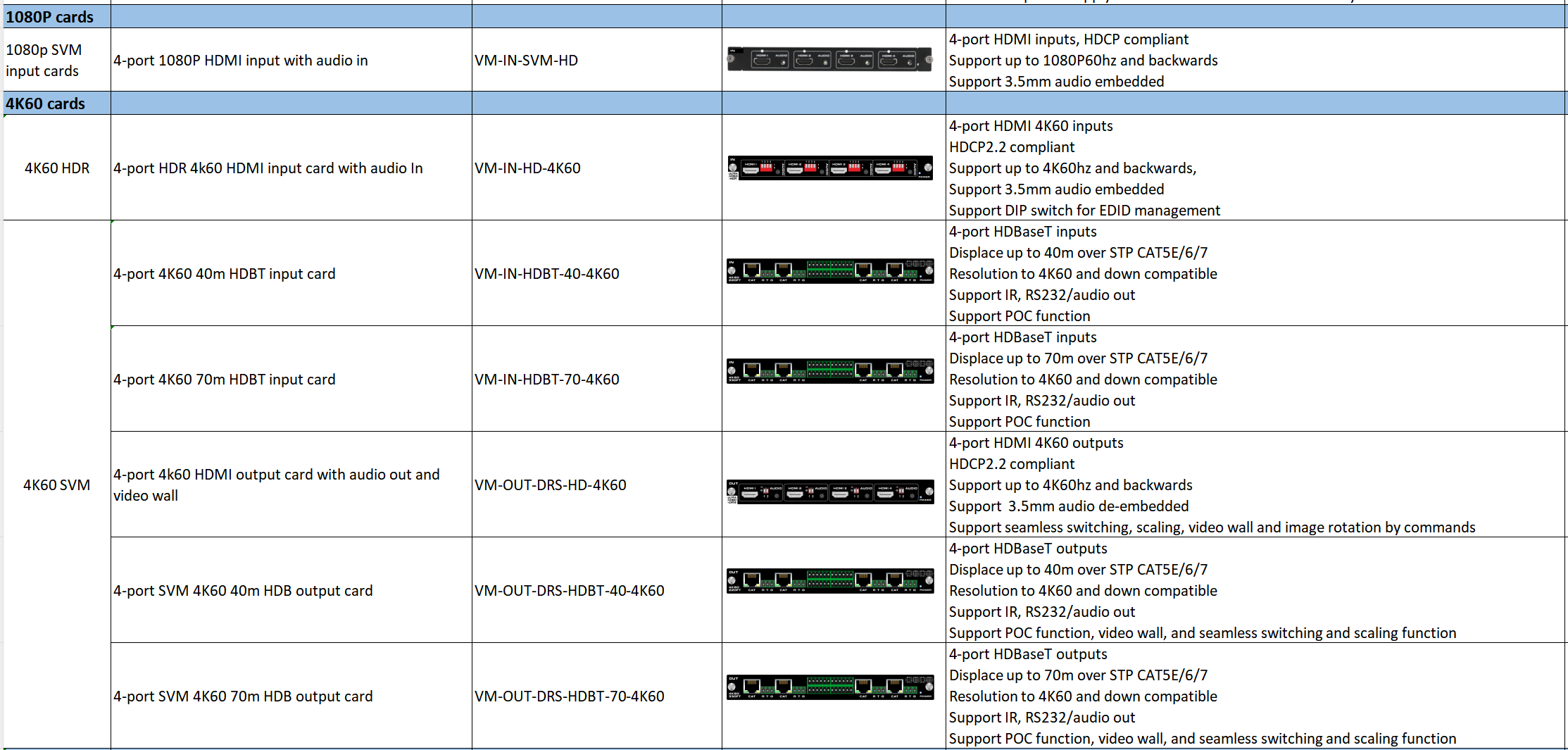 | Output | 1-card 4-port output, including DVI/HDMI/VGA/CVBS/YPbPr/SDI/ HDBaseT/Fiber |