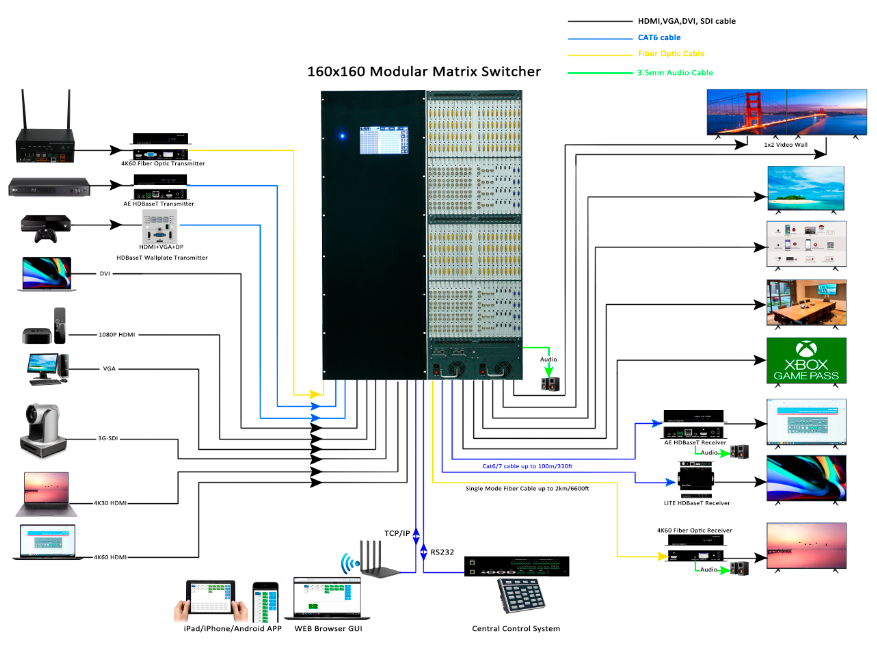 This is a modular matrix switcher, with 160 input slots and 160 output slots, so it can support maximum 160 inputs and 160 outputs, all the input and output cards are using 1-card 4-port, the signals are including the DVI, HDMI, HDBasT, Fiber Optic, 3G-SDI. Users are able to have mixed signals inputs and mixed signals outputs.