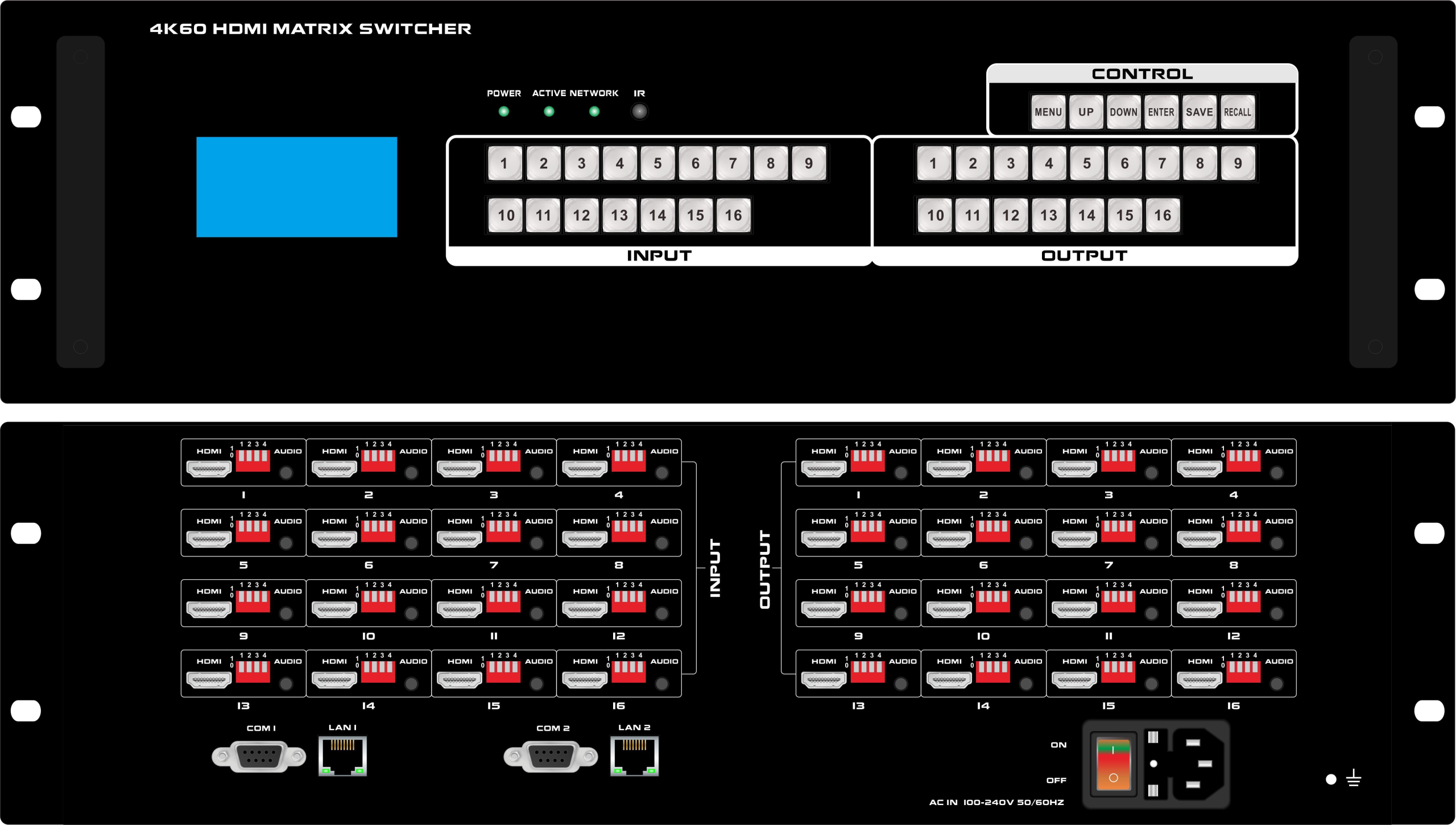 | Description | 16×16 HDMI 2.0 matrix switcher with audio |