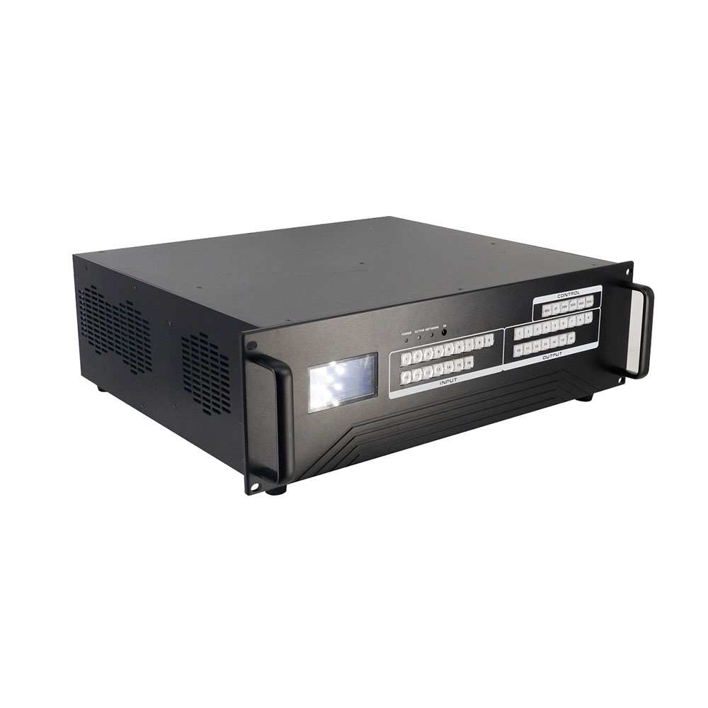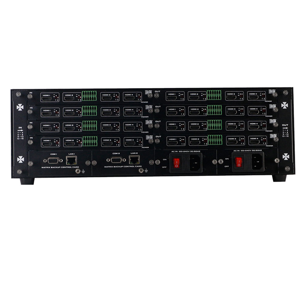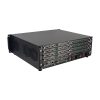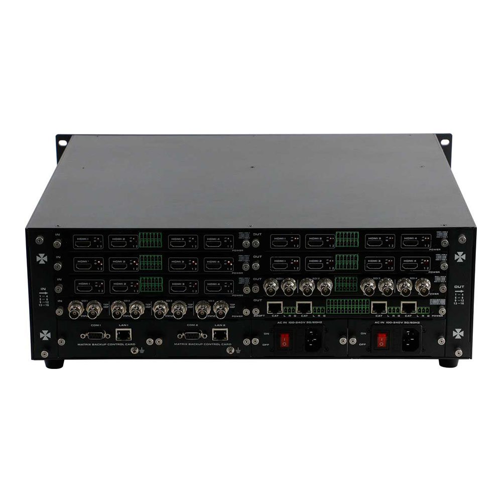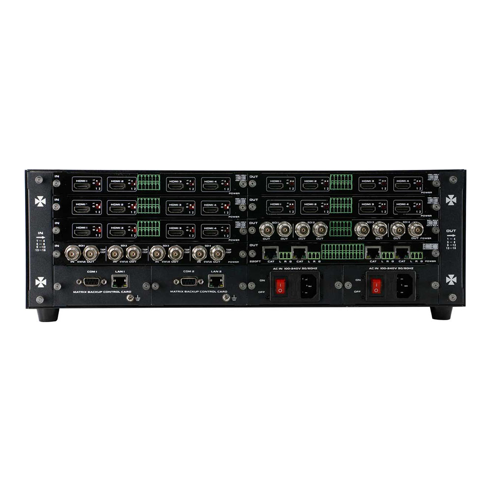 This is a modular matrix switcher, with 4 input slots and 4 output slots, so it can support maximum 16 inputs and 16 outputs. It can support variety of interfaces including DVI, HDMI, HD Base T, Fiber Optic, 3G-SDI. The single channel signal switching speed can reach 12.5Gbps, and the main board is using four core four links processing technology, the switching ability speed can reach 32Gbps. With uncompressed transmission technology for the digital signal to make sure the image high fidelity output. Unique signal links shielding designing technology to make sure the signal completeness, the internal data switch has strong capacity of resisting disturbance, long continuous and stable working ability. Supports 7*24 continuously working and with dual LAN and RS232 backup control, it’s convenient for users to control via PC, iPad, APP and the 3rd party control by RS232 control commands.