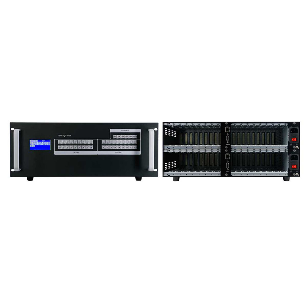 This is a modular matrix switcher, with 18 input slots and 18 output slots, so it can support maximum 18 inputs and 18 outputs, all the input and output cards are using 1-card 1-port, the signals are including the DVI, HDMI, HDBasT, Fiber Optic, 3G-SDI. Users are able to have mixed signals inputs and mixed signals outputs.