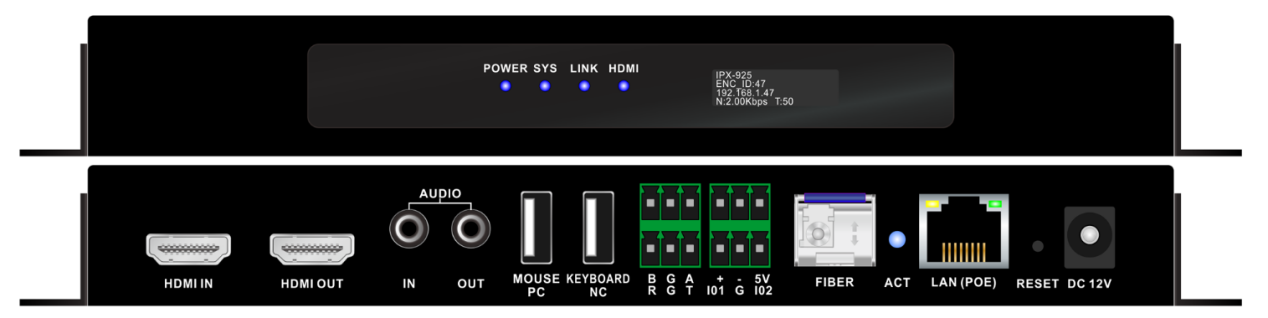 This is a 4K30 HDMI over IP system, have Encode&Decode integrated into one device, any of the unit can be used as the encoder or decoder, supports 2*3.5mm audio in&out, 2*USB ports for Keyboard&Mouse/Host, 1*RS232, 1*RS485, 1*Relay and 1*I/O central control interfaces; Support Fiber or LAN ports transmission, this distance can up to 150m over CAT6 or 2km over Fiber, supports POE function and DC power supply. The front panel LCD screen can showing the model/ID/IP/Status which is easier for installation settings.