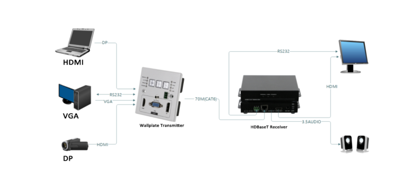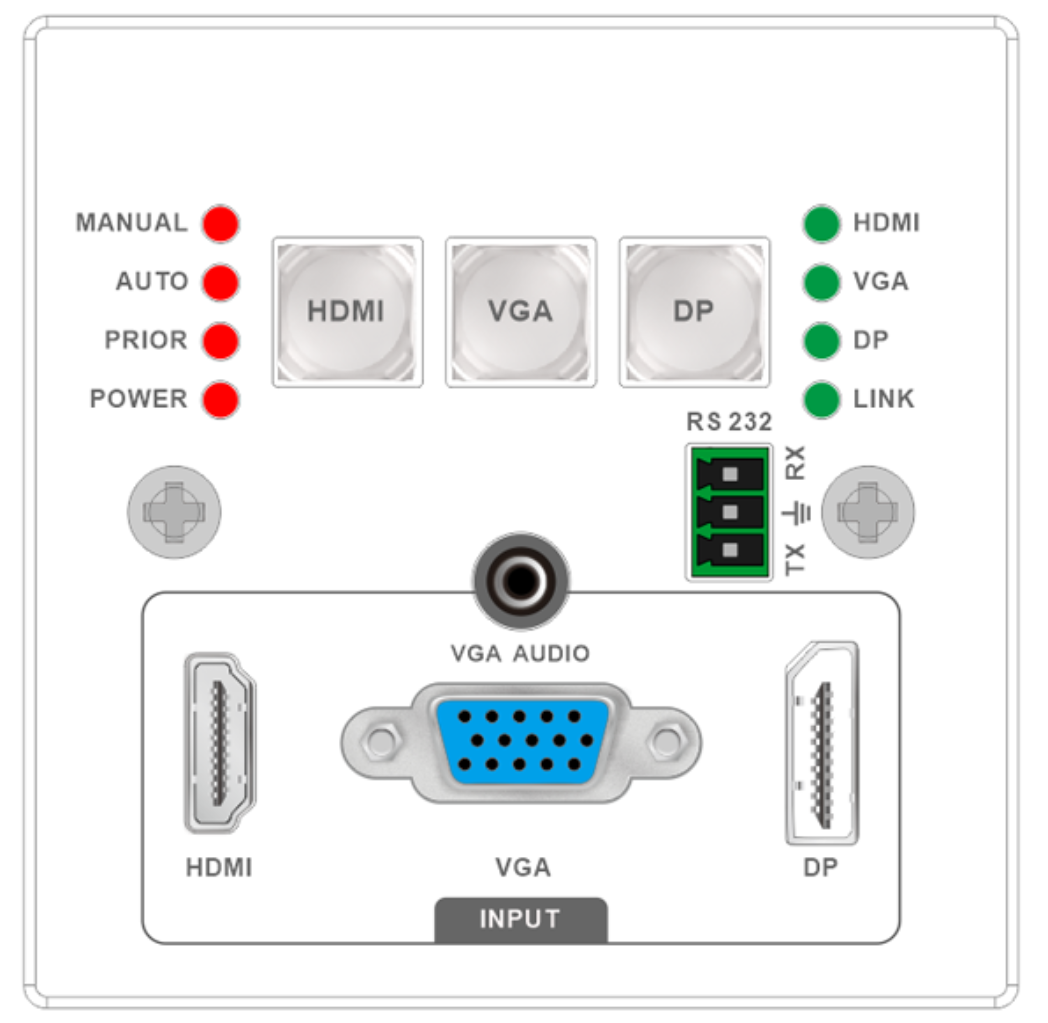 It’s an HDBaseT Wallplate transmitter which supports 1*HDMI, 1*VGA+audio and 1*DisplayPort inputs, bi-directional IR over single HDBaseT(RJ45) output. It also supports three working modes: Manual, Auto or Priority. The resolution can up to 4k@30hz, with the POC(power over cable) function, users can only power on the HDBaseT receiver. It also supports bi-directional IR.