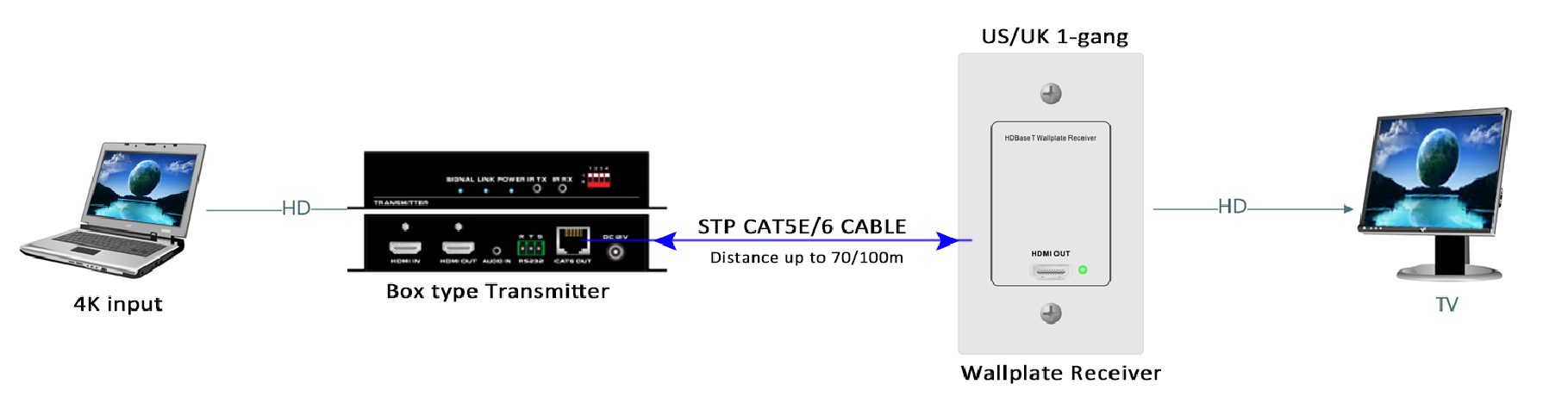 • Transmission distance: 220ft/70m at 1080P60, 110ft/35m at 4K30 via Cat5e/Cat6