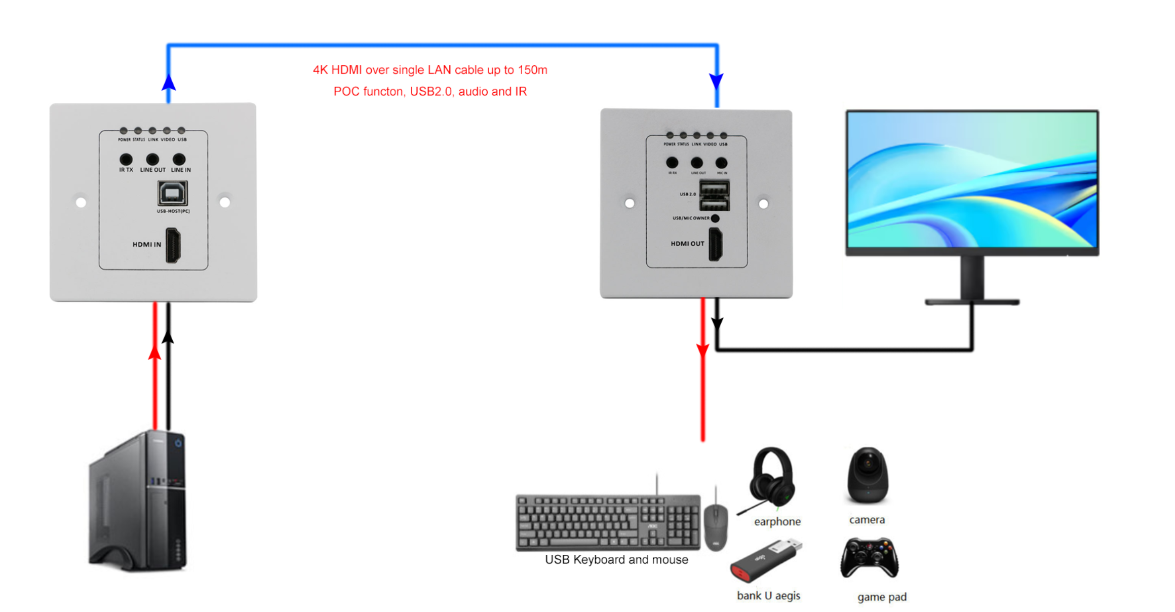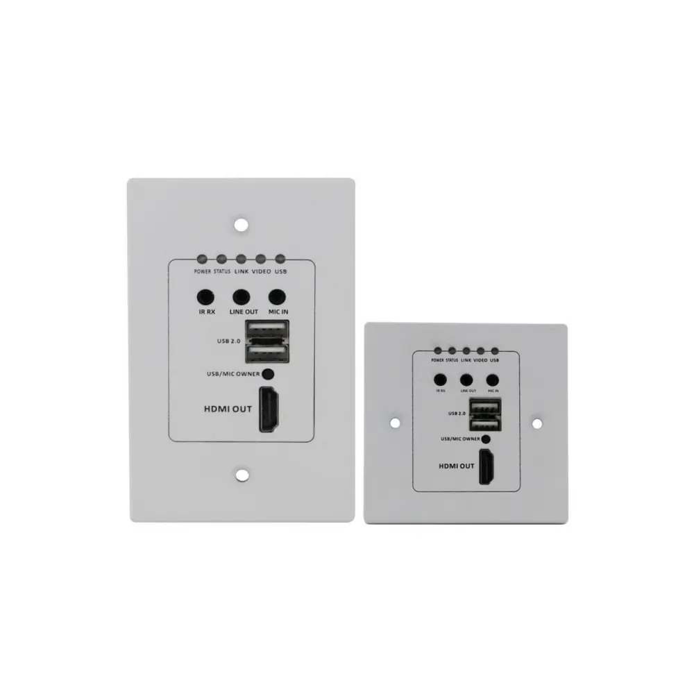 It’s a 4K HDMI+IR+USB2.0 Wallplate receiver. It also supports the HDMI or USB2.0 transmission only, so it can be used as USB2.0 over CAT extender. The HDMI resolution can up to 4k@30hz and the distance can up to 150m over single Cat6, also supports the the POC(power over cable), so that users can only power on either side with the power adapter. It’s popularly used in the small meeting room, classroom or other long distance transmission applications.