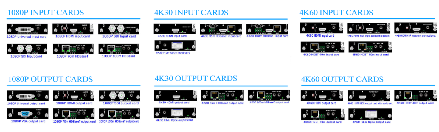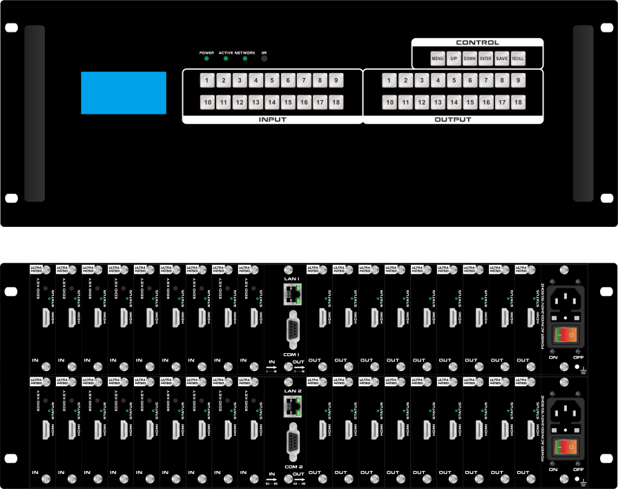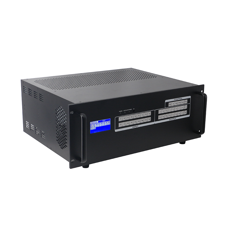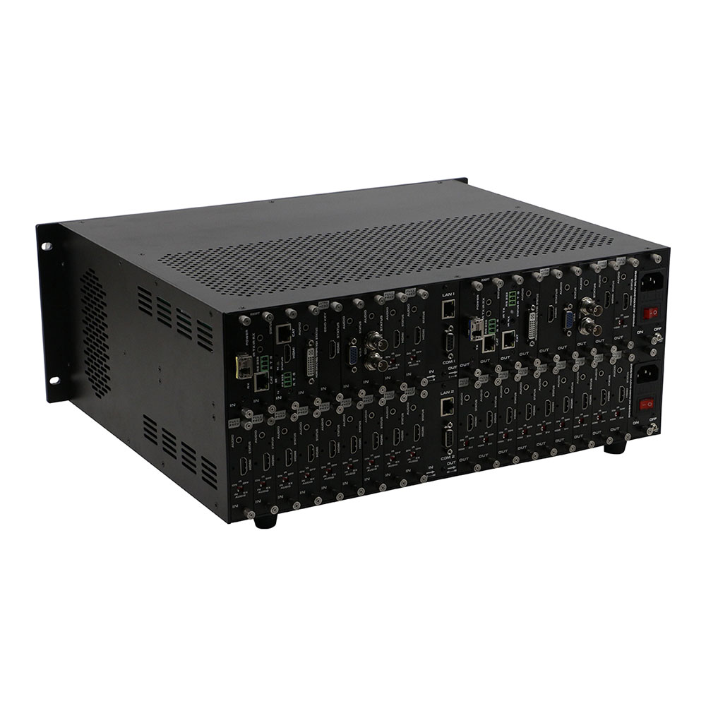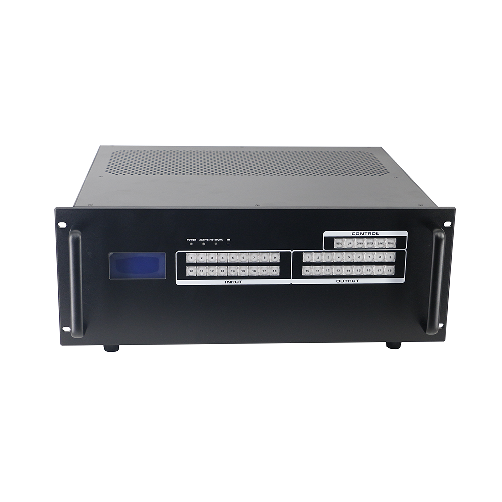 Esse é um switcher de matriz modular, com 18 slots de entrada e 18 slots de saída, de modo que ele pode suportar no máximo 18 entradas e 18 saídas, todas as placas de entrada e saída usam 1 placa e 1 porta, os sinais incluem DVI, HDMI, HDBasT, fibra óptica, 3G-SDI. Os usuários podem ter entradas e saídas de sinais mistos.