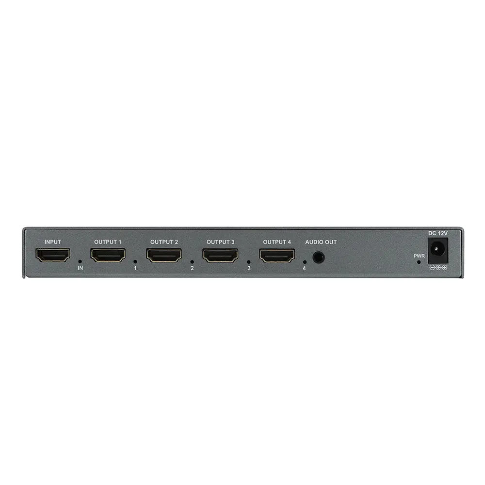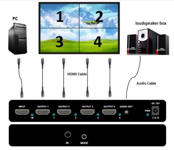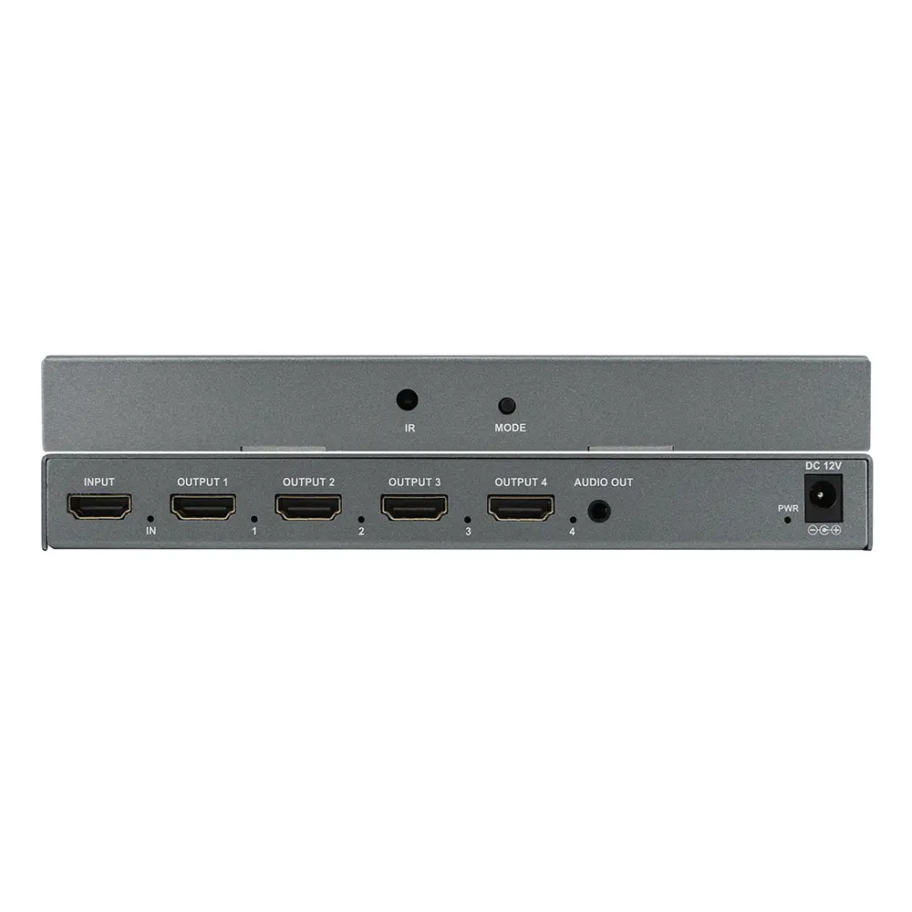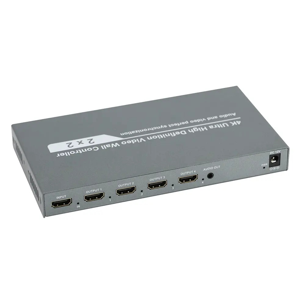 This 2X2 video wall controller supports 1 HDMI input and 4 HDMI outputs, and its main function is to divide a complete HDMI high-definition image signal into 9 blocks and distribute them to 4 video display units (such as rear projection units, LCD TVs, etc.), to create a dynamic image large screen with 4 HDMI high-definition video display units.