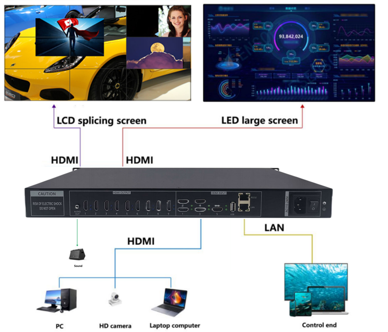 This video wall controller supports 5 HDMI inputs(1*4K60 and 4*1080P60) and 9 1080p HDMI outputs, with the PC control software, it can support to customize ultra-high resolution perfect display for users, the resolution can reach NxM, N=1920*n(column), M=1080*m(row) to provide users with perfect detailed image display. It also can support the PIP with up to 9-win per screen, cross-screen, background image and scrolling text those functions, with the PC software to manage all the settings, support video wall content echo preview, renaming, audio control. This video wall controller is perfect for the shopping mall, commercial, meeting room and control centers.