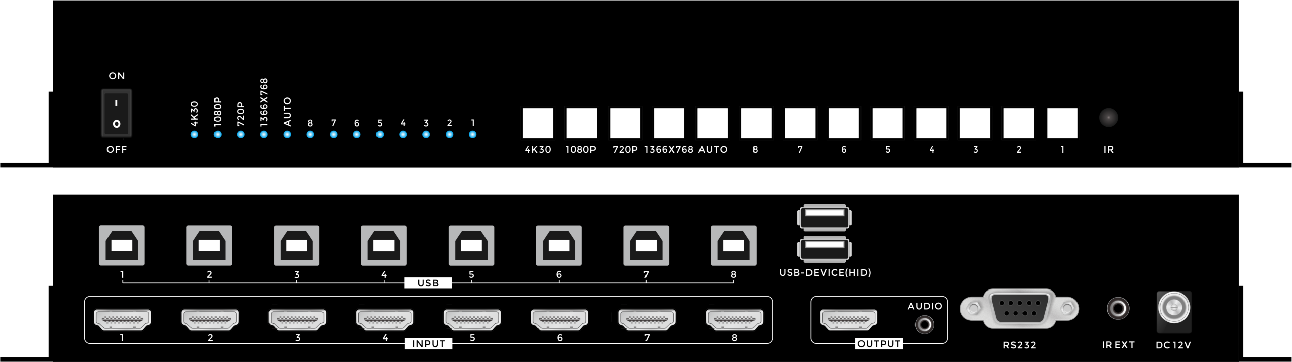 This product is an HDMI 4K seamless and scaling switcher, supports automatic switching and manual switching, supports switching from 8 HDMI with 8 USB-B inputs to 1 HDMI output with 2 USB-A for Keyboard&mouse, and 8 HDMI inputs support different arbitrary resolutions with seamless switching and scaling. The HDMI output supports fixed resolutions output, which can be selected through the front panel buttons, infrared remote control, RS232 serial port commands and the Keyboard Hot-key switching. Also supports EDID management through RS232 commands.