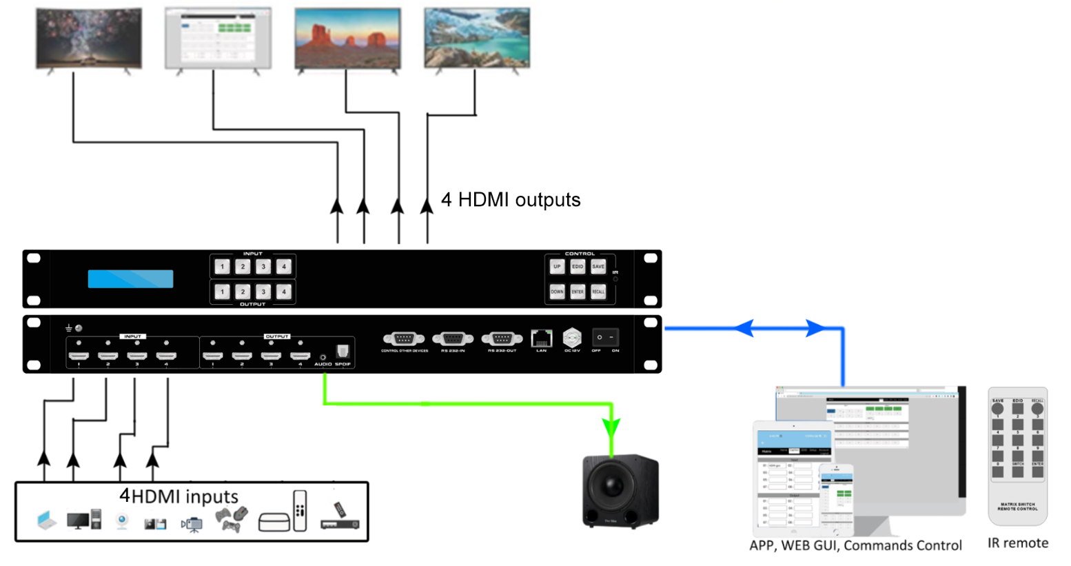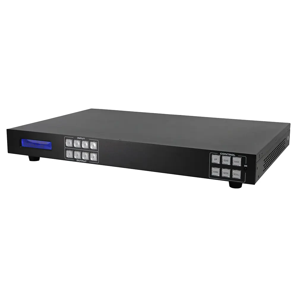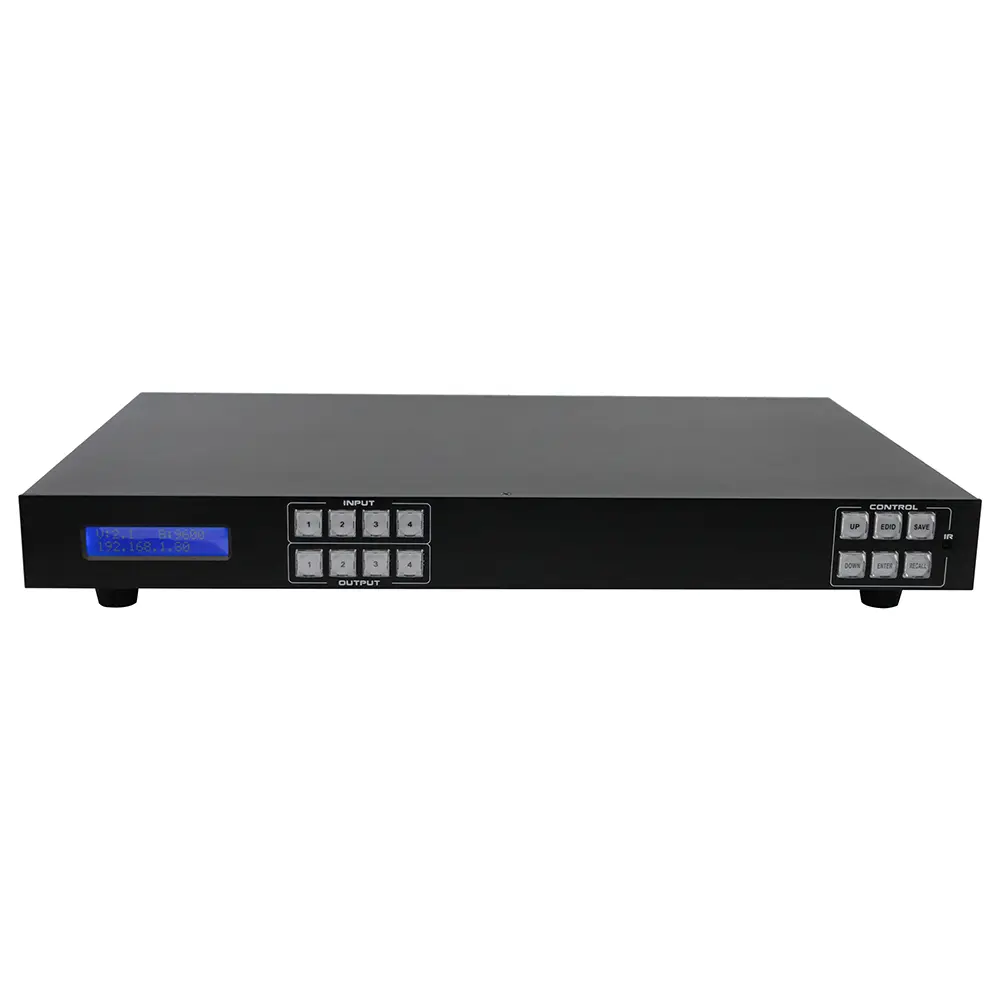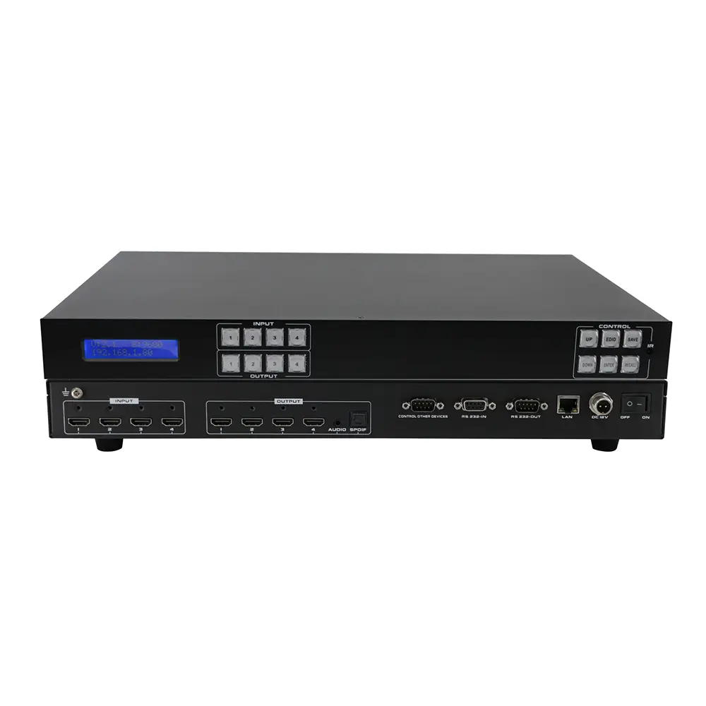 This is a new fixed 4K60 HDMI matrix switcher with 4 HDMI2.0 inputs and 4 HDMI2.0 outputs, the resolution can up to 4K60Hz and all ports are HDCP2.2 compliant. With the friendly user control methods by IR remote control, 2-Press push buttons with background blue light, WEB GUI, APP and RS232/UDP commands, this matrix switcher can work with the Blu-Ray Players, Set-Top boxes, Home Theater, and game consoles etc HDMI input sources to route to the HDMI displays, it has been widely used in different audio visual applications. Features
